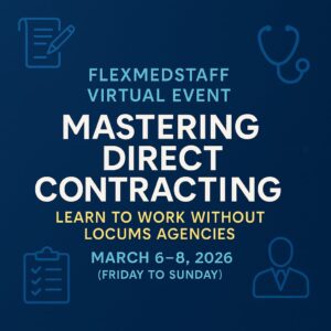 The Mastering Direct Contracting is a virtual event from FlexMedStaff that gives you the knowledge, tools, and confidence to step into the world of direct contracting. You’ll learn how to set your own rates, negotiate on your own terms, and create flexible clinical arrangements that put you, not an agency, in control.